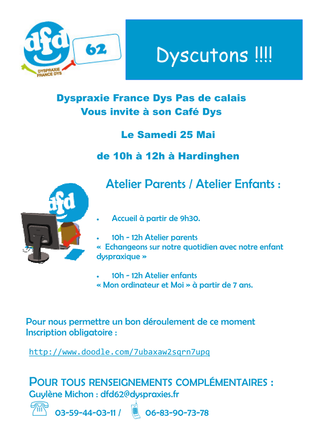 Dyspraxie France Dys Pas de calais vous invite à son Café Dys le Samedi 25 Mai de 10h à 12h à Hardinghen.